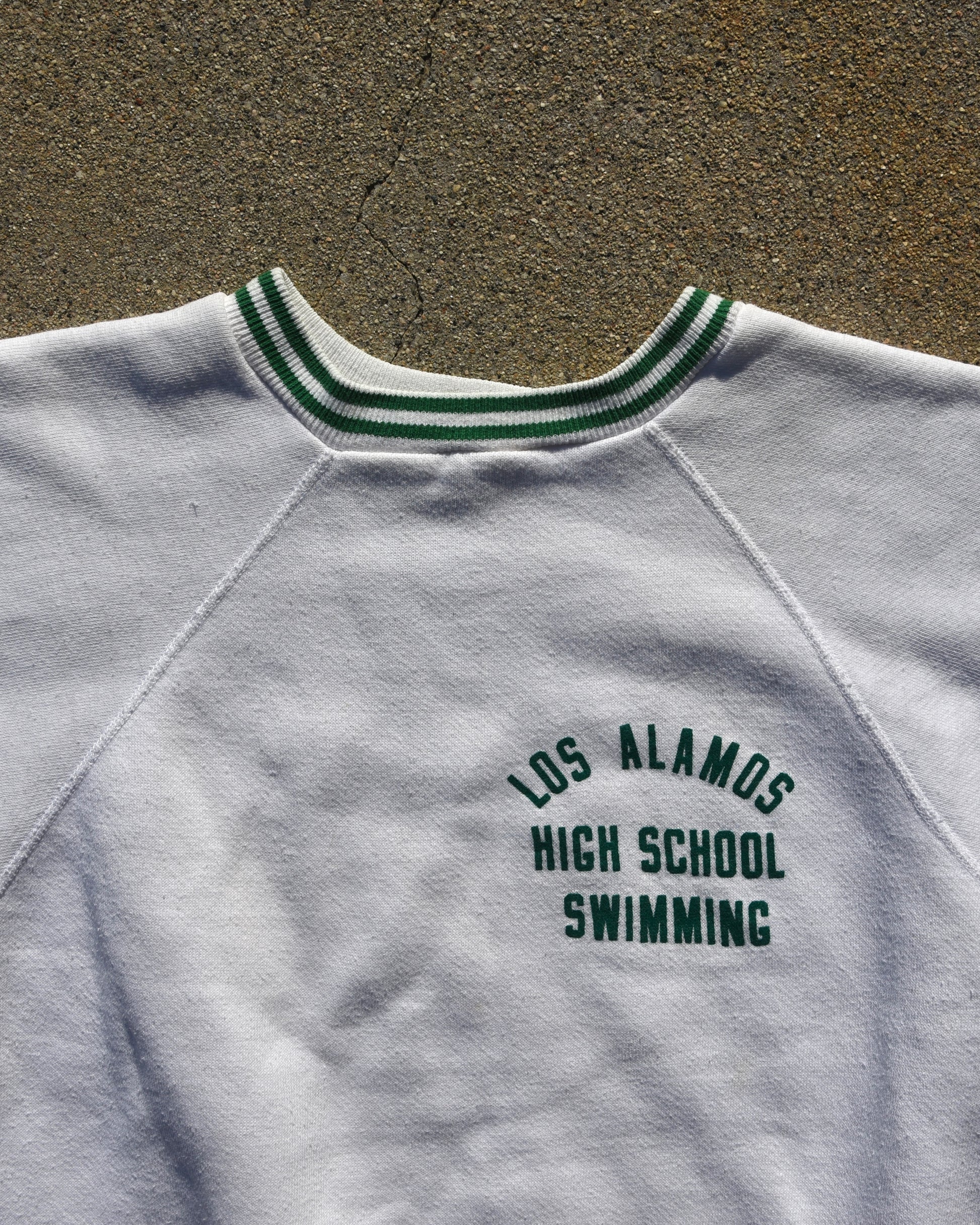 True Vintage 1950s Los Alamos High School Swimming short sleeve sweatshirt. Has signs of wear and markings throughout. Made in USA. Tagged size medium