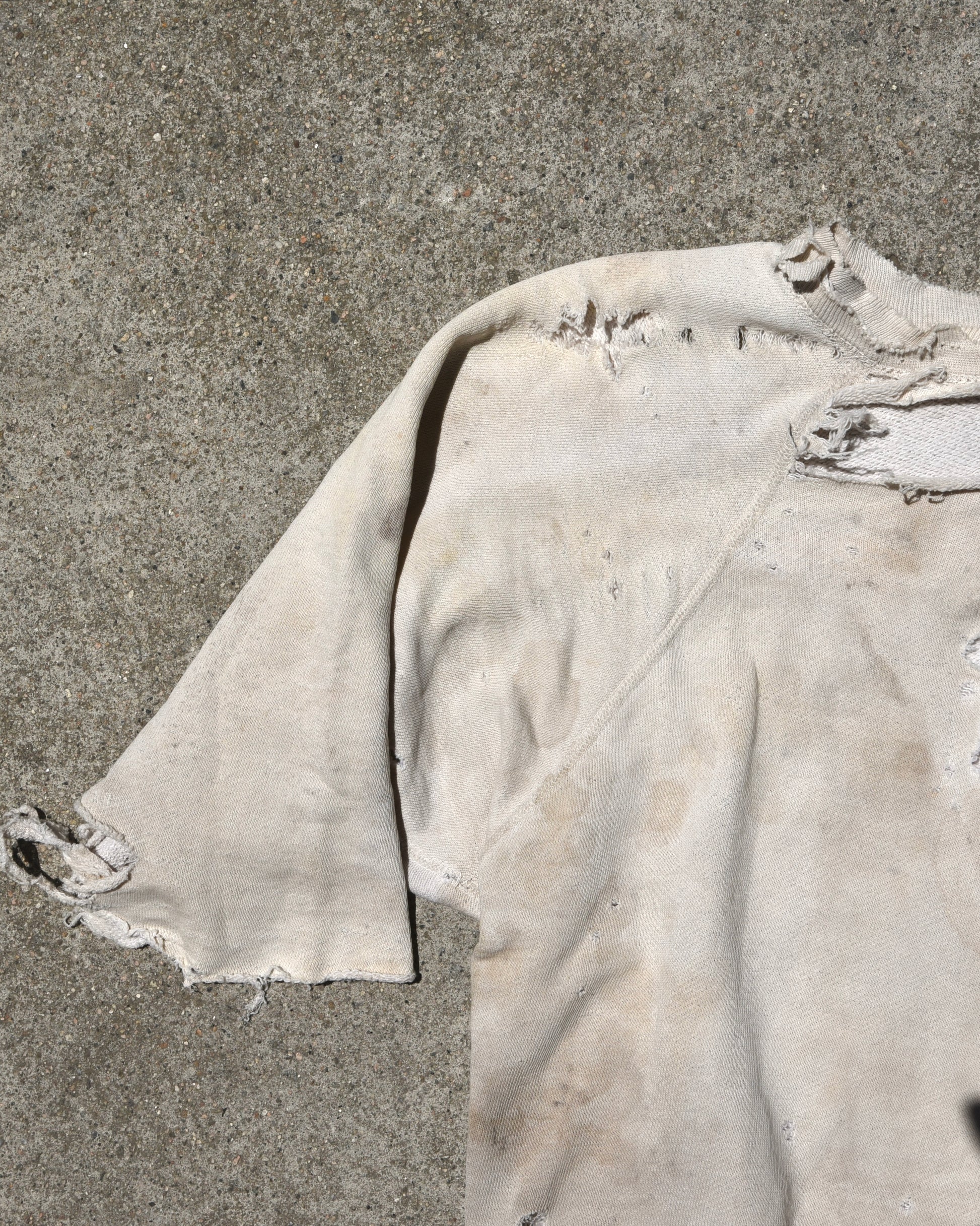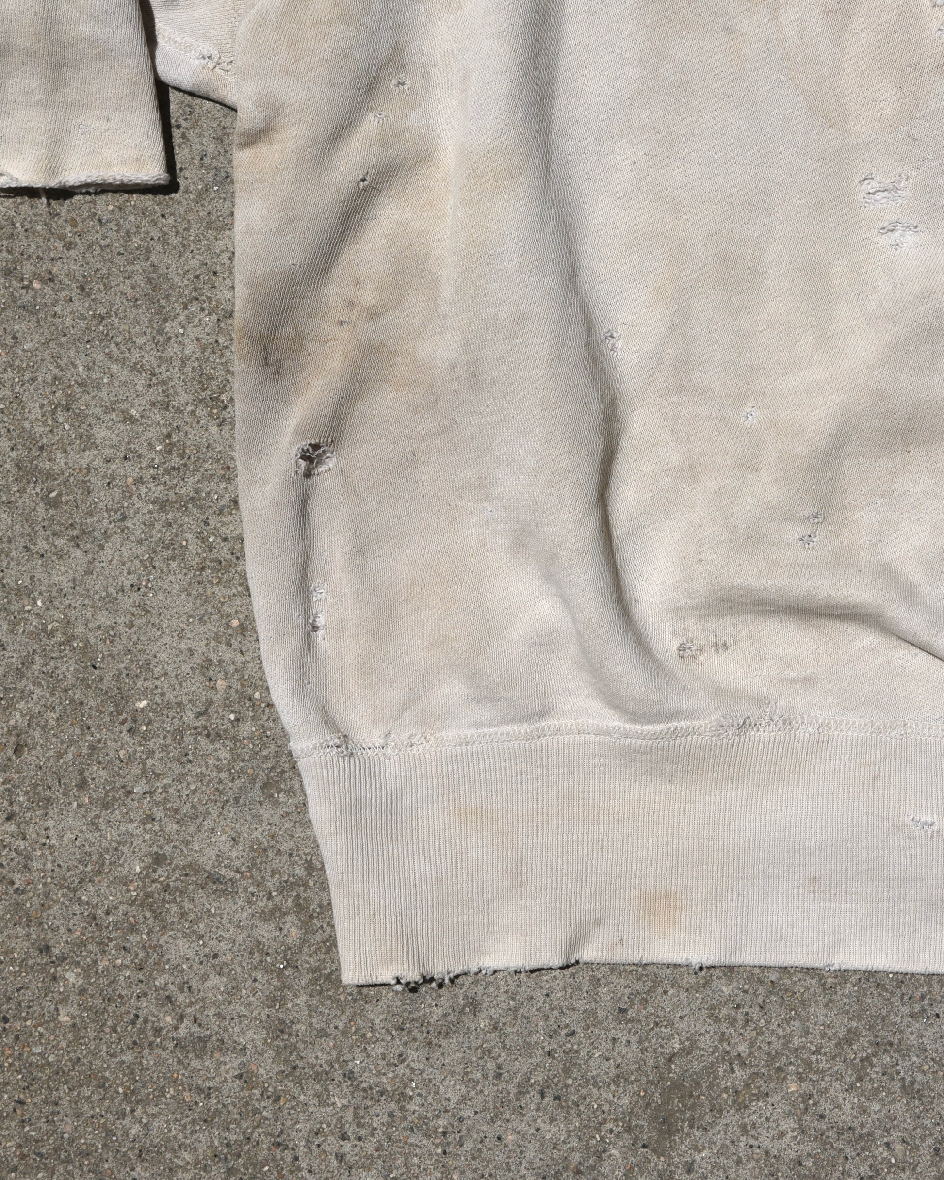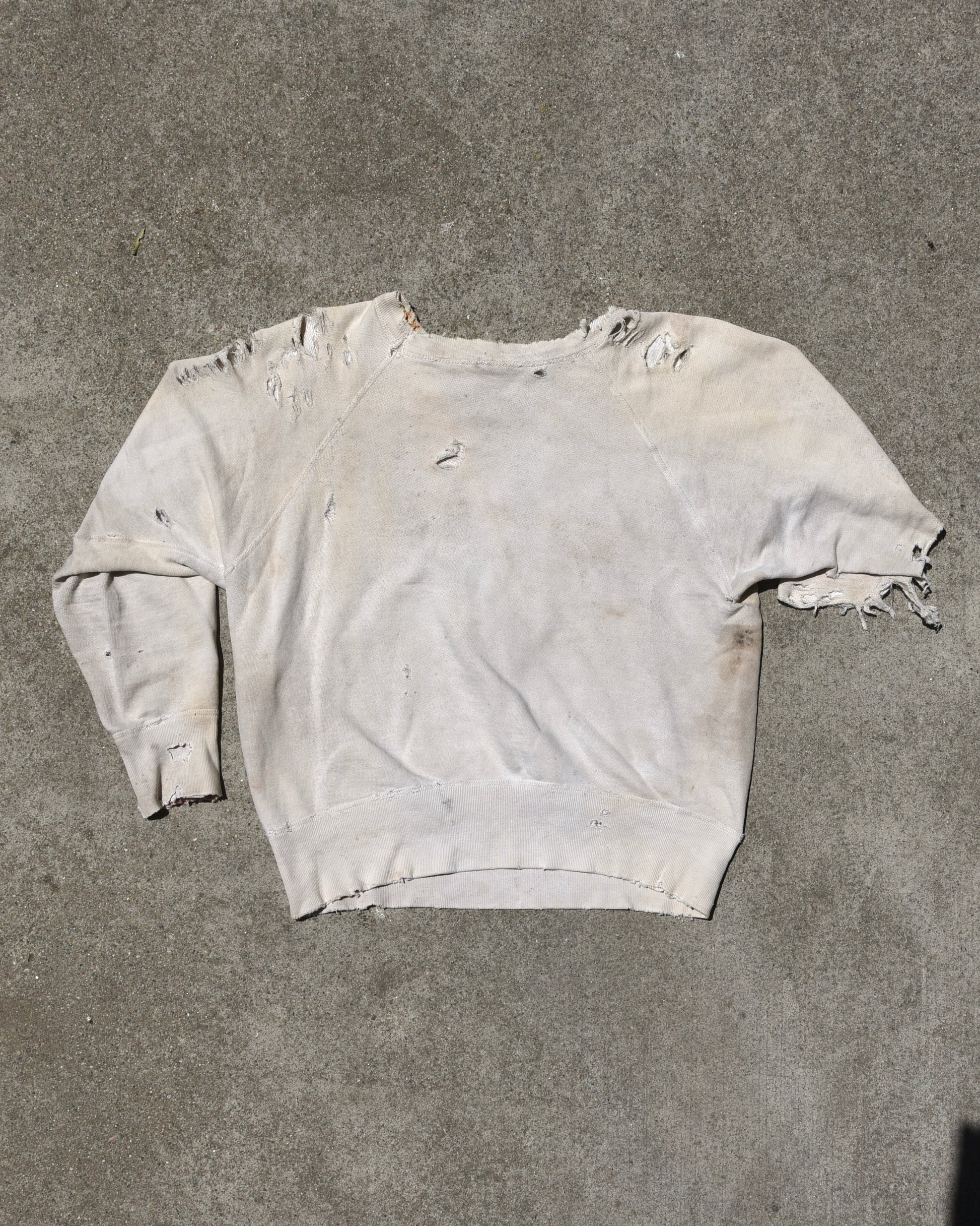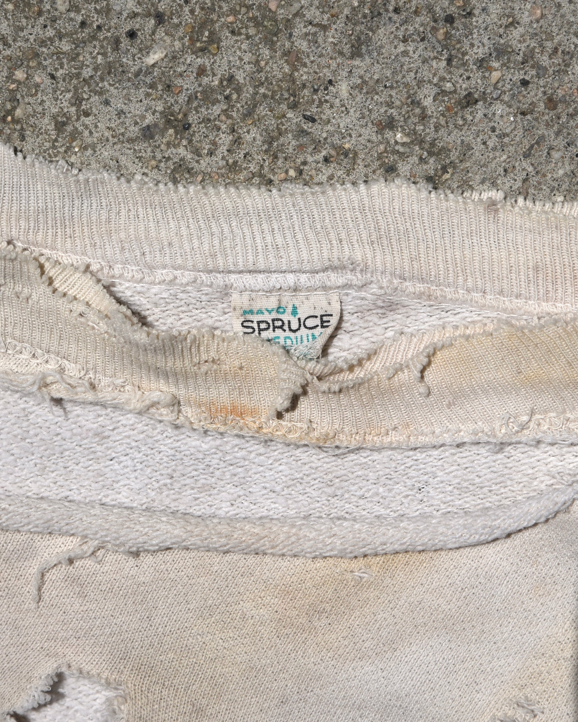 Vintage thrashed 1950s Mayo Spruce Sweatshirt. Absolutely thrashed and distressed heavily all throughout. One arm completely blown off from elbow down. Love the look of this. Not for everyone. Tagged size medium