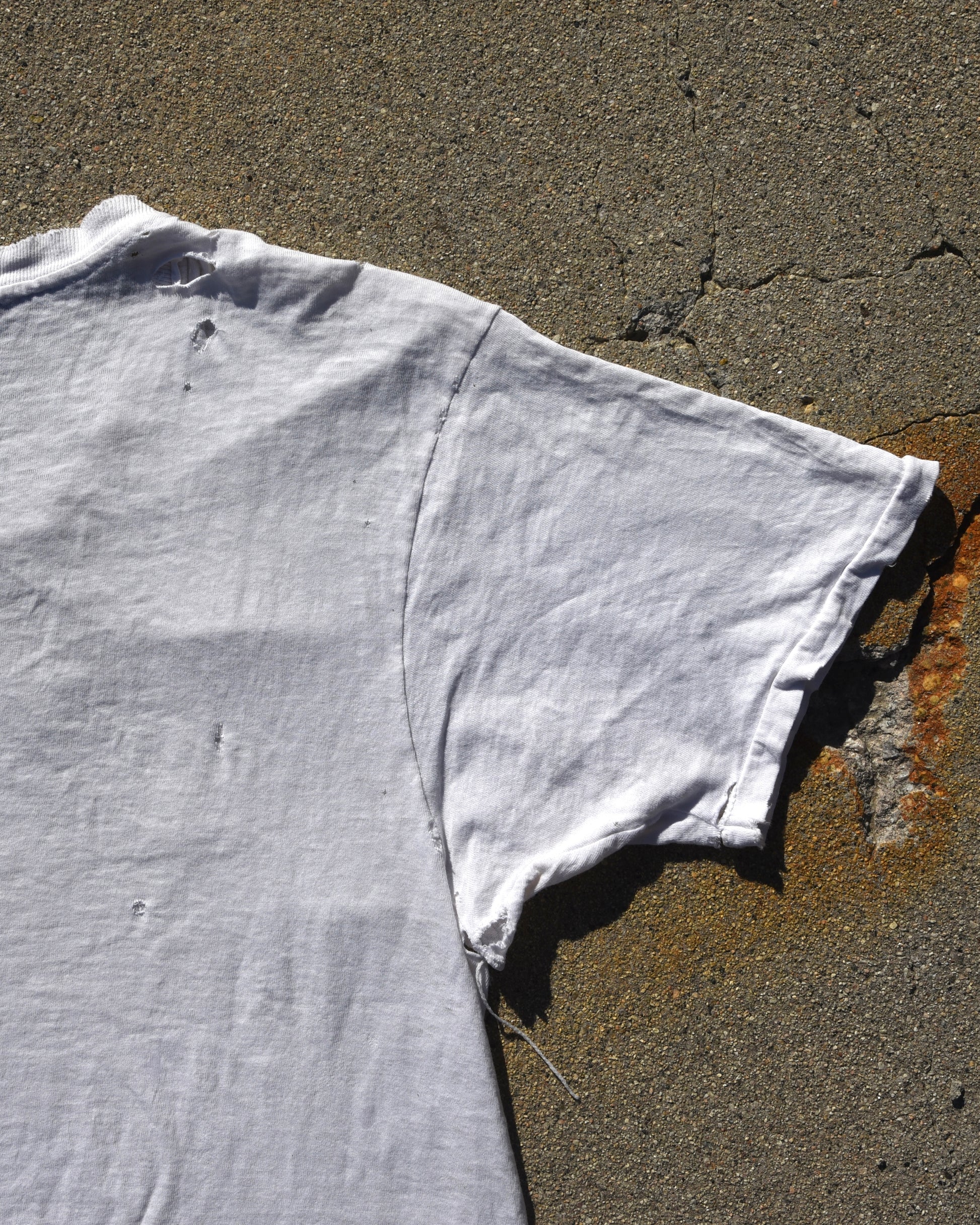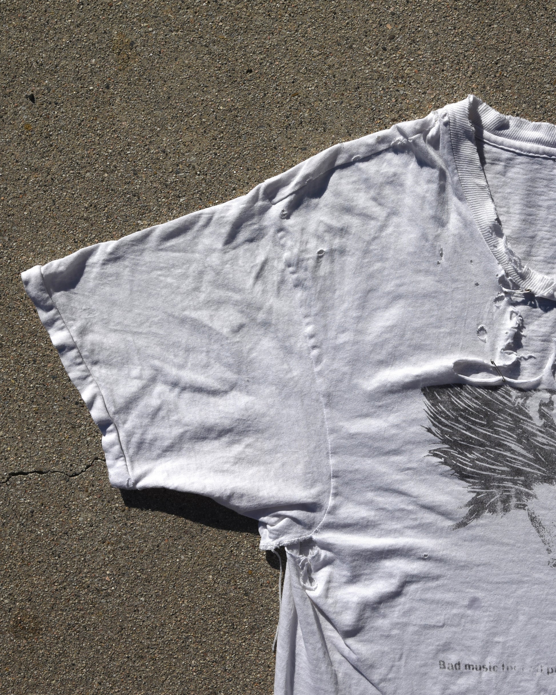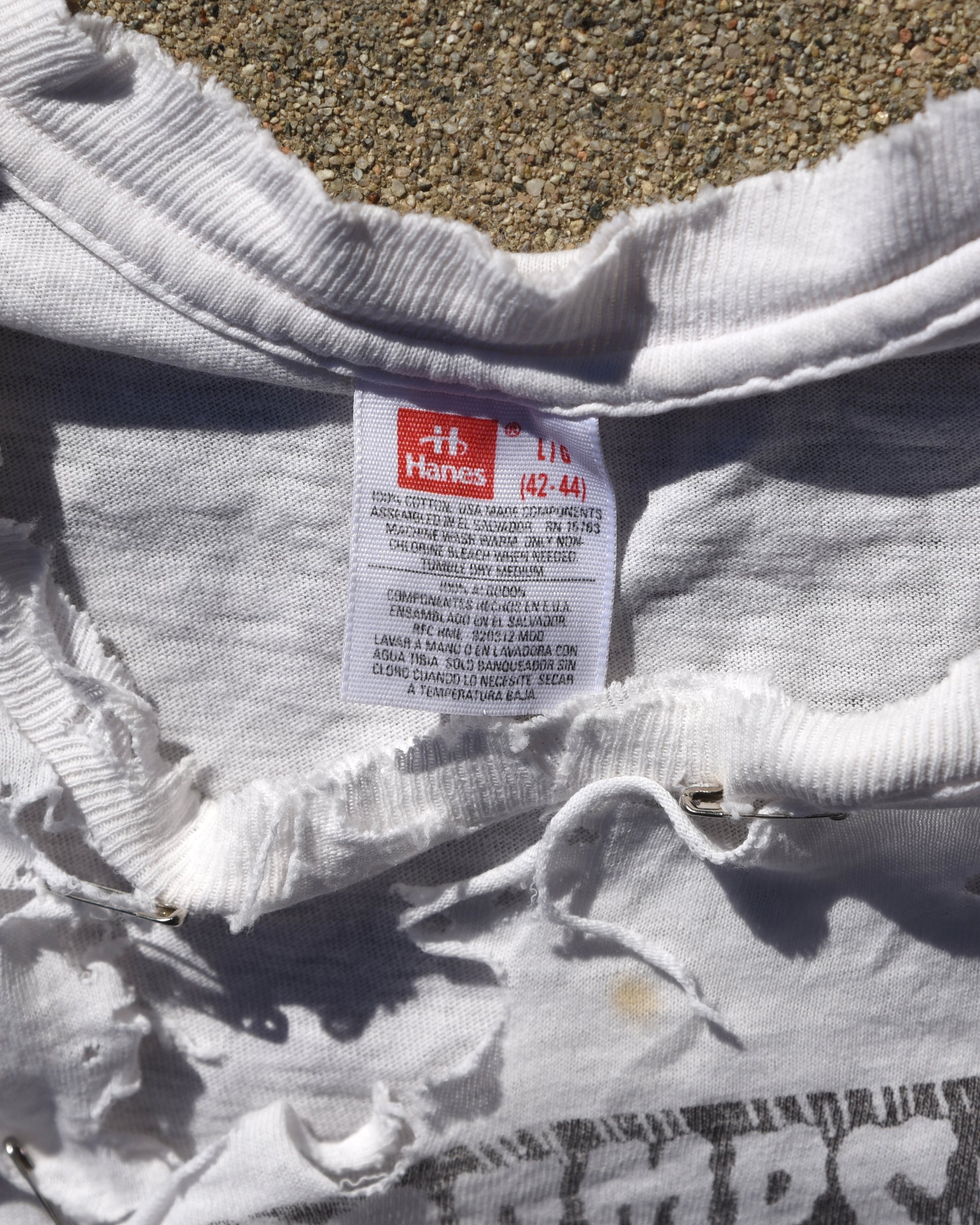 Vintage 1980s Cramps band Tshirt. Thrashed heavily throughout. Tee hem has been cropped. Single stitch sleeves. Safety pins used to hold some holes together but can be removed. Tagged size large but fits more like a medium