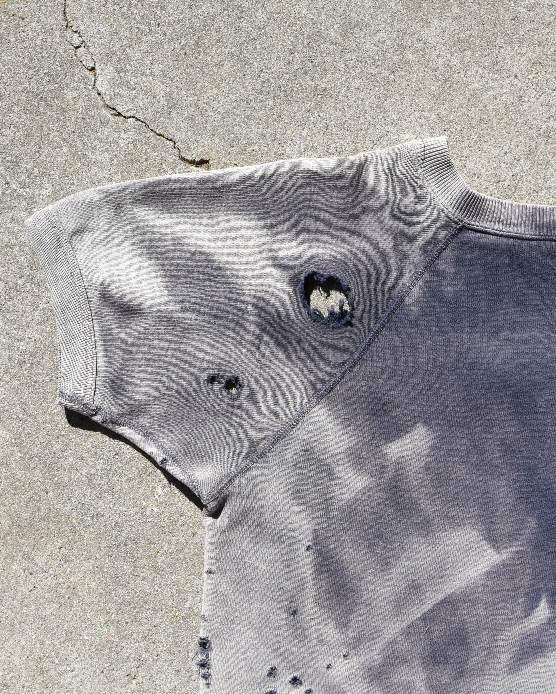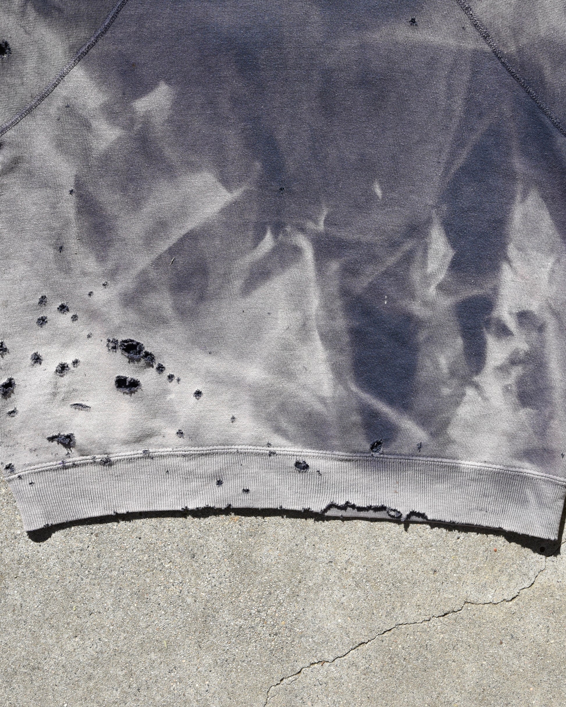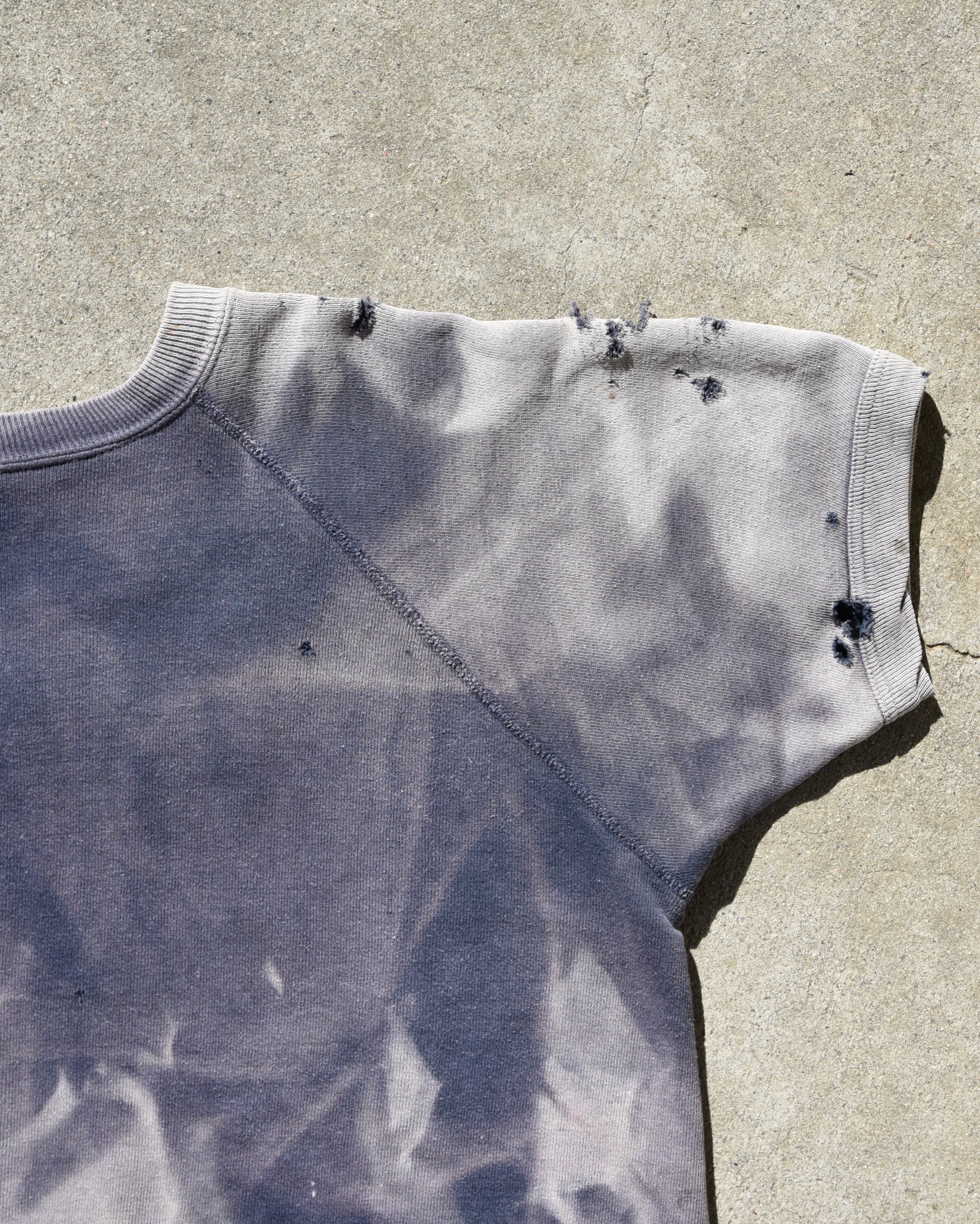 Heavily thrashed and sun faded short sleeve sweatshirt from the 1960s. Some of the most insane marbling and fades you’ll see on a vintage sweatshirt. Repaired in some parts. Fits like a medium