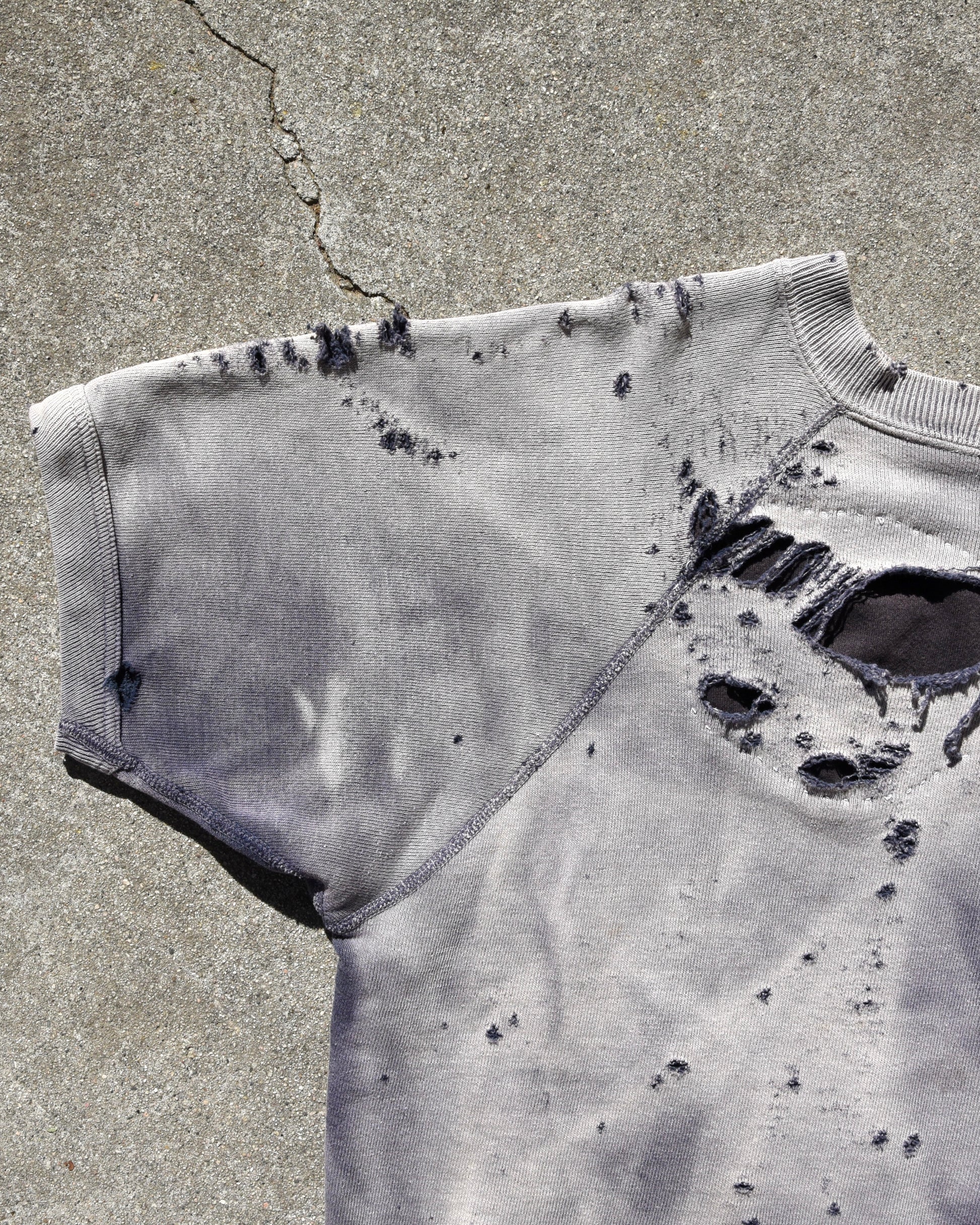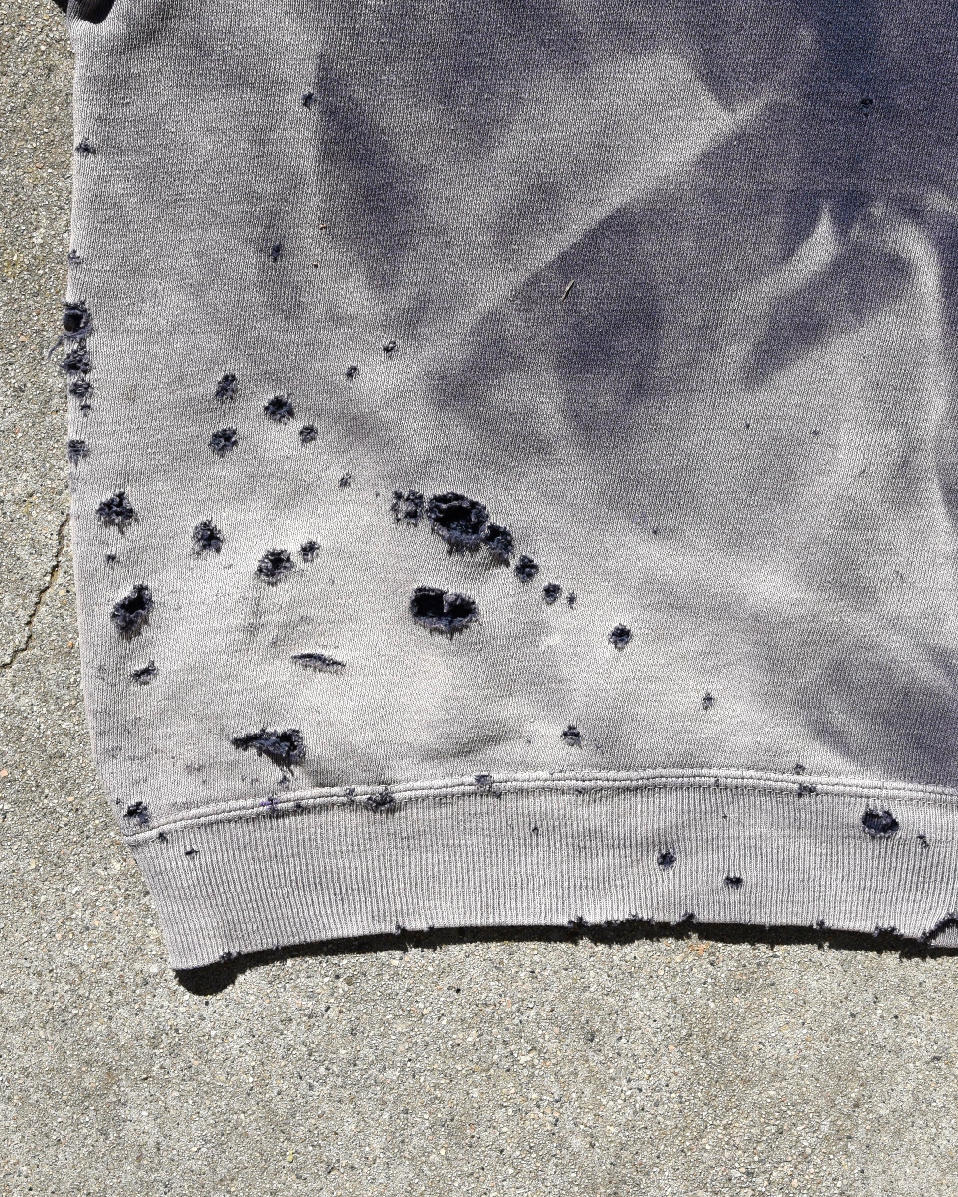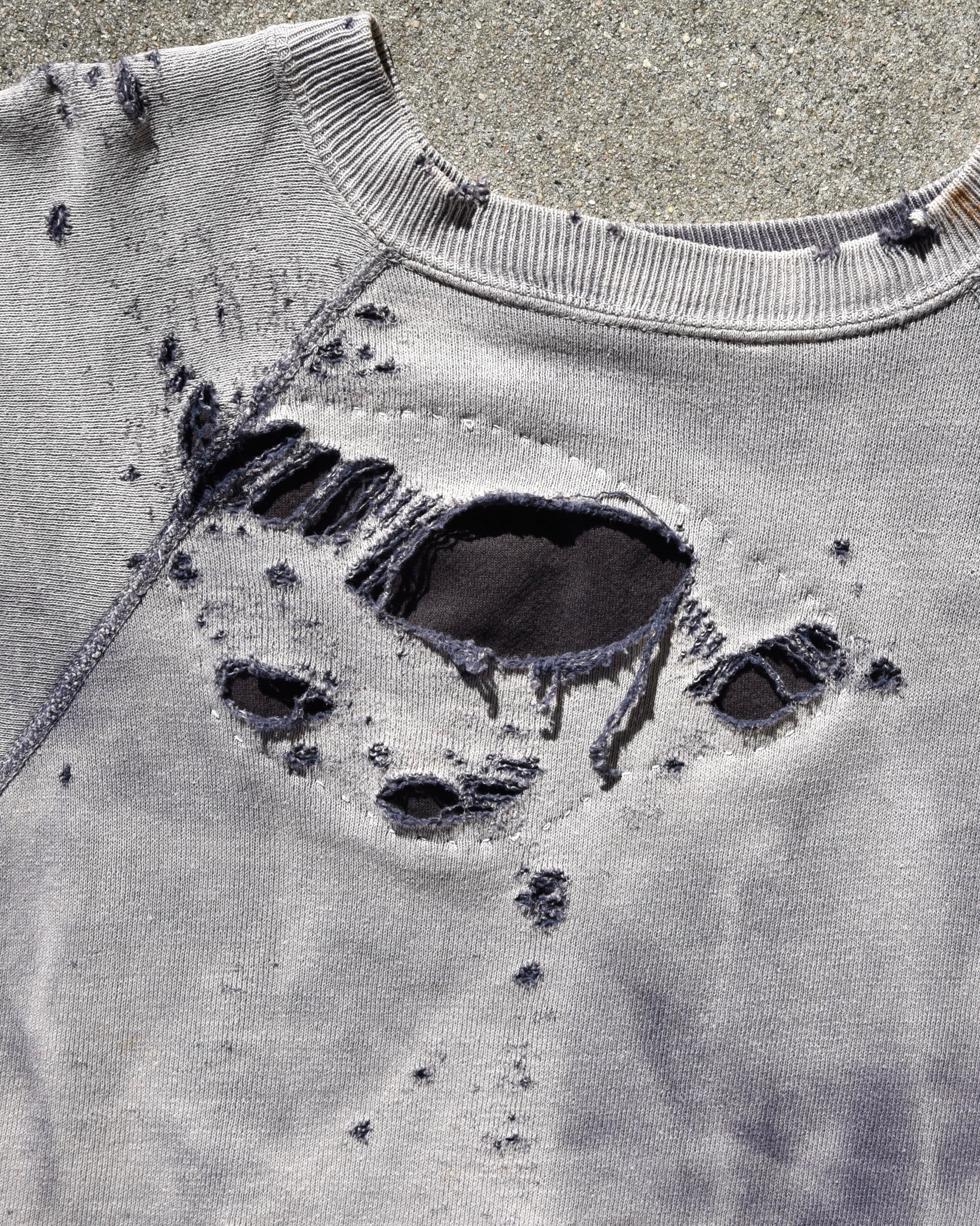 Heavily thrashed and sun faded short sleeve sweatshirt from the 1960s. Some of the most insane marbling and fades you’ll see on a vintage sweatshirt. Repaired in some parts. Fits like a medium